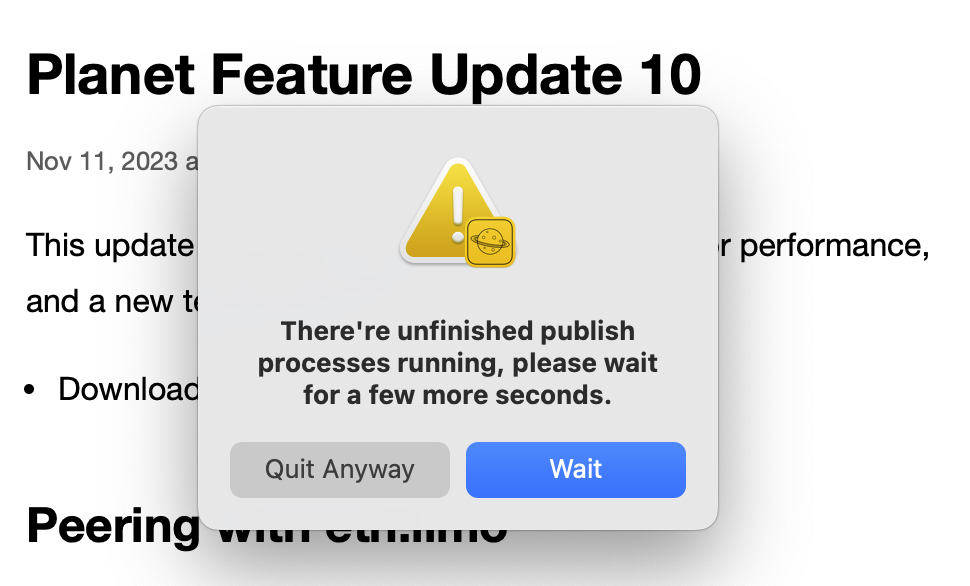 A confirmation dialog will now show if you try to quit the app while it is performing IPNS publishing (indicated by an animating hourglass in the sidebar). Previously, quitting the app during this process could result in unfinished IPNS publishing and cause the website to fail to resolve.